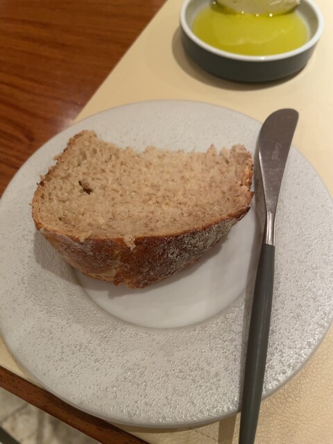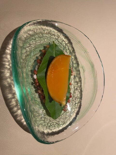 テーブル席を予約したはずですが、1人だからカウンター席だったので、目の前で調理してくれている光景が見えます。でもカウンターはオーナーシェフから直接説明を聞けて良いです。飲み物は、3種のグラスワインペアリングにしました。まず1種目はスペインのバスクのチャコリ。イタリア大衆店みたいにコップに入れて飲むスタイル。先つけは、クレープの上にピーマンのペーストの料理。次に黒い揚げパン。どちらも美味しい。揚げパンは中も黒く、柔らかく、どこかで食べたような味を感じた。白ワインのチャコリは相当果実味があり美味しい。水はガス入りを頼んだので、シュワシュワ炭酸。タパス3種は、スペインの味を感じるブリ、ピーマンを刻んだものを載せたメヒカリ、上海ガニのタルト。上海ガニは初めて食べました。どれもとても美味しく、上海ガニのタルトは優しい味わいで、絶品でした。次のキャビアを載せたトリハ(スペインのフレンチトースト)があまりにも美味しすぎて笑った。多く乗っているキャビアは燻したため燻製の味がして、塩気も効いていて、フレンチトーストはこれまで食べたフレンチトーストとは格が違うくらい美味しい。塩気が効いている。もうあまりにも美味しすぎて言葉を失った。至福of至福。次は炭火で焼いたカツオとカツオのソースを混ぜて食べる料理。カツオ美味しいじゃん!高知のあの生臭い藁焼きカツオはなんだったんだ!次はシェリー酒で味付けをした乳化させたフォアグラ。こちらは当店のスペシャリテだそうです。上にまぶしてあるカカオが酸味を軽減させて、最高のバランス。これが料理ってやつよ。バランスバランス。続いてのワインは、北海道のノートル・シエクル。こちらはブドウの品種は非公開だそう。やはり美味しい。続いては、エビとソブラサラダ(スペインのサラダ)。スペインでは、海のものと山のものを一緒に食べようという考えがあるという。ソブサラダもどこかで食べたようなとても古の懐かしい味がする。とても美味しい。スープはエビの頭と豚の喉肉で出汁を取ったスープ。しっかりエビの味がして美味しい。次は、ルッコラステーションのサラダ。上から焦がしバターのソースをかけてもらいます。焦がしバターのソースが本当に香ばしくて美味しい。こんなに美味しいサラダは初めてですよ。ここで燻製バターとオリーブオイルをつけて食べるパンがやってきました。バターも燻製の味で美味しいです。たっぷりつけるととんでもなく美味しい。至高。目を瞑ってしまう。オリーブオイル自体も最高品質。もうグルメはやめらんないねと改めて思ってしまう料理の数々。次は黒ムツのピルピルソースかけ。ピルピルソースはバスクのソースだそう。どこかやさしいあじわいで、パンチのあるオリーブオイルと燻製バターをつけたパンと相性が良いかも。喧嘩しない。オリーブもほんのり効いている。もう驚きの料理の数々です。最後のワインは、テンプラニーリョで作られたテルメス。スペインとポルトガルの国境付近で作られたワイン。辛口で渋くてすごい美味しいまさに至高のワインですね。でもソムリエはこの香りを嗅ぎ分けて、味を言語化できるのがすごいですね。最後のお肉料理ですが、ナイフは立てて置かれる場合もあるんですね。さて来ました。肉料理です。牛の肩の部分をわざと赤みが残るように焼いたお肉。手前はブルーベリー。肉はシャリシャリ感があって美味しい。食べれば食べるほど美味しい。ハマる。奥のオレンジのソースがすごい美味しい。たまらない。肉も大きく切って食べた最後の一口が1番至高でした。至高のメインでした。最初のフルーツは紅マドンナという柑橘類(?)。次は、