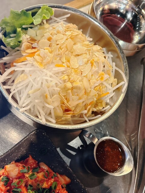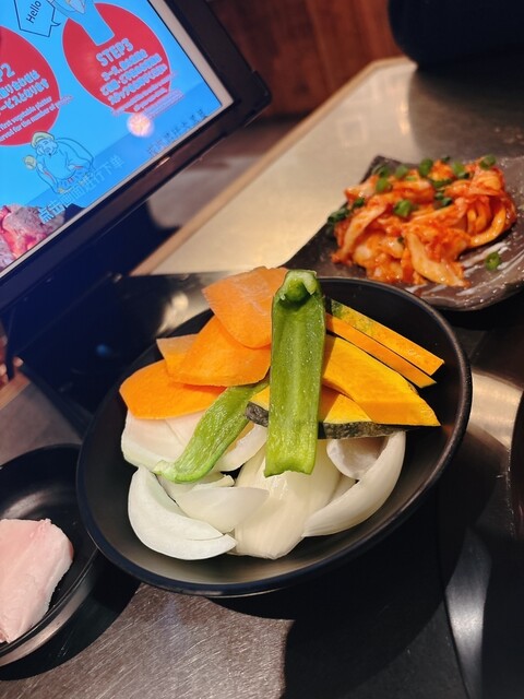 ラムロール、サラダ、野菜焼き、キムチ