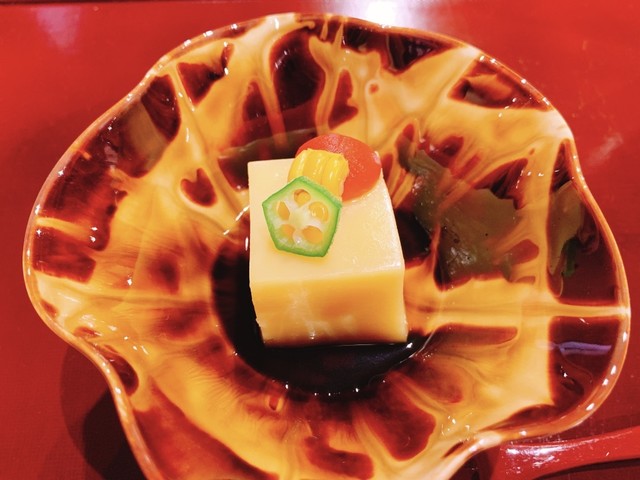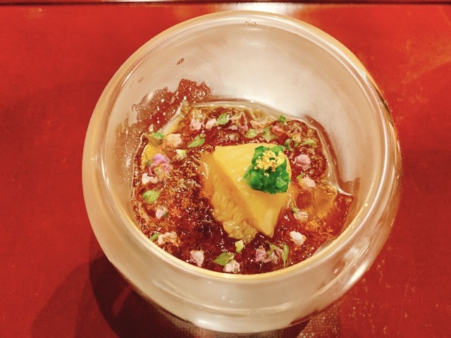 最初に出して頂いたお料理は毛蟹と九十九里の蛤の土佐酢ジュレ。実はお酢のお料理はあまり得意じゃないのですが、こちらのお料理は別格。優しい土佐酢が爽やかで暑かった日にマッチしています。