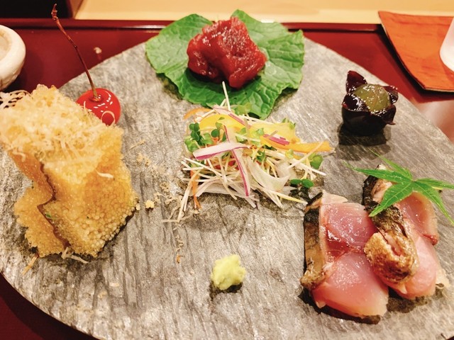・長崎の穴子の白焼き、ヤマゴボウの漬物、さくらんぼの漬物、揚げた蓮とクリームチーズとホタルイカの燻製