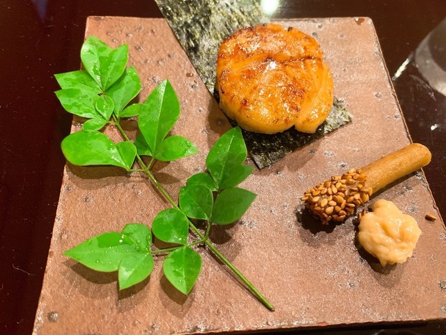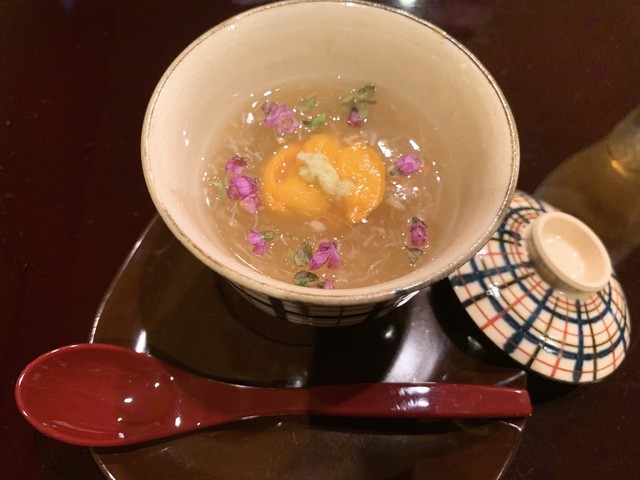 ズワイガニ、ホタテの鱧真丈(ハモの卵の餡かけ)、紫ウニ(根室)