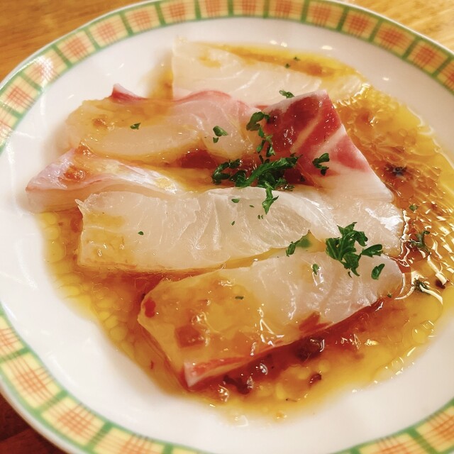真鯛のカルパッチョの分厚さが堪りません。