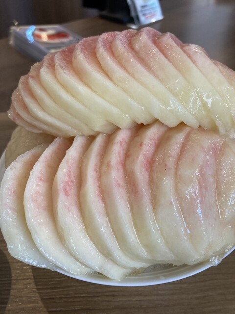 生桃のかき氷は、大量の桃がカットされてかき氷の上に添えられてます。かなり甘めの桃ですね。かき氷の上に大量の桃汁がかけられていて、その上に桃が載っています♪