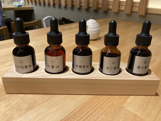 テーブルに置いてある数種類のスポイト式の醤油を、それぞれの寿司ネタに垂らしながら頂きます♪