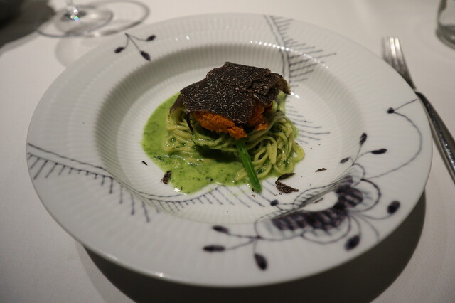 蕗の薹のスパゲティは早春を感じさせ、雲丹の黒トリュフのタリオリーニは非常に濃厚で香り高い逸品、