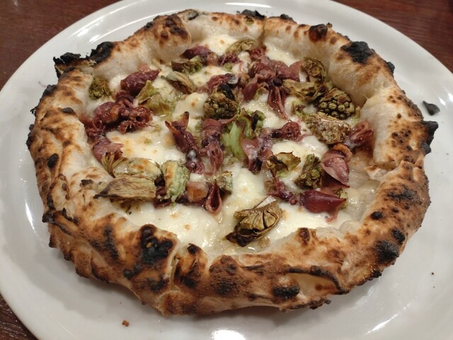 前回頂いた逸品「サンマリナーラ」はシーズンオフになり、代わりにカラマーリ(イカ、万願寺ししとう、ケッパーの乗ったマリナーラ)が登場。