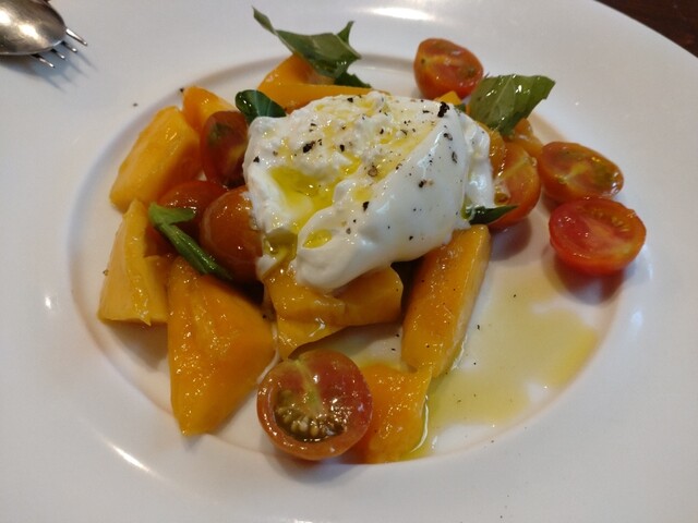 挟んでいないカプレーゼにマンゴーを併せたような料理ですが、このマンゴーの美味しいこと。単体で食べて美味しく、モッツァレラやトマトを併せると複雑味が増して美味しく、毎度食材の見極めの素晴しさに感動します。