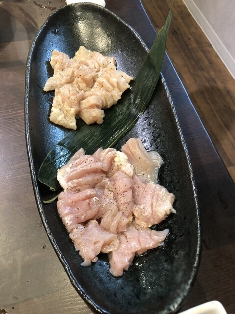 まずはハツ刺し登場、角の立った切り口から鮮度が分かります。塩の効いた胡麻油で食べるのが堪らん♡