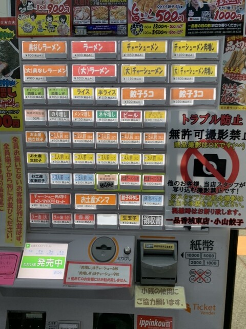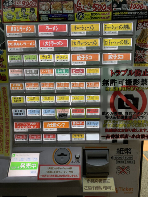 来店したらまず食券を買う。これを知らずに食券を買わずに列んでしまうと後で強制的に列び直しになってしまうので注意してほしい。他にも客に向けた店のルールなどの注意書きも多い。毅然とした客対応といえば聞こえは良いが、当事者にとって心象は良いものではない。他人に強く薦める大好きな店でありながら、身内など大事な人への紹介については慎重になるジレンマの原因はそこにある。