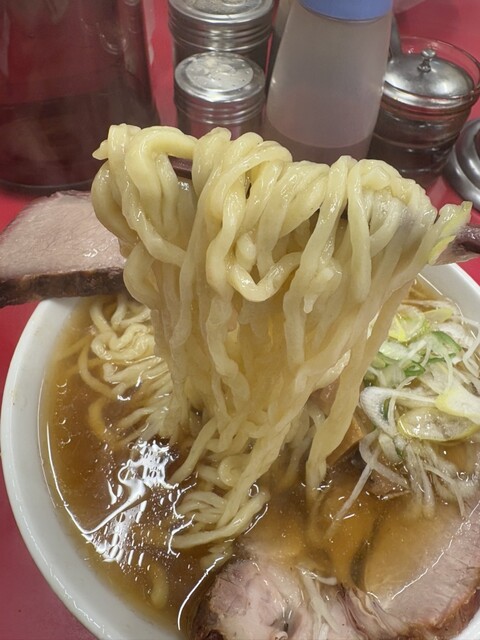 麺はコシが強くギュッとした噛み応えが堪たまらなく良い。並盛で十分お腹いっぱいになる重い麺だ。佐野ラーメンと比較する人もいるだろうが、あるいは、うどんのようだと表現する方が近いという意見もあるだろう。