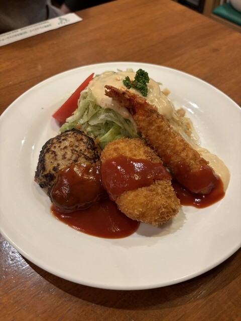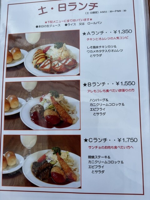(照り焼きステーキ、カニクリームコロッケ、エビフライ、サラダ、生ジュース、パンorライス) …〜…〜…〜…〜…〜…〜…〜…〜…〜…〜…〜…〜