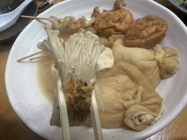 大根、玉子、たこ、しいたけ、チーズロールキャベツ、ごぼ天、春菊、もち巾着、厚揚げ、すじ、ひろうす、UFO、糸こんにゃく、ねぎ袋、湯葉、さえずり、豆腐、えのき、タコ酢、花くじら