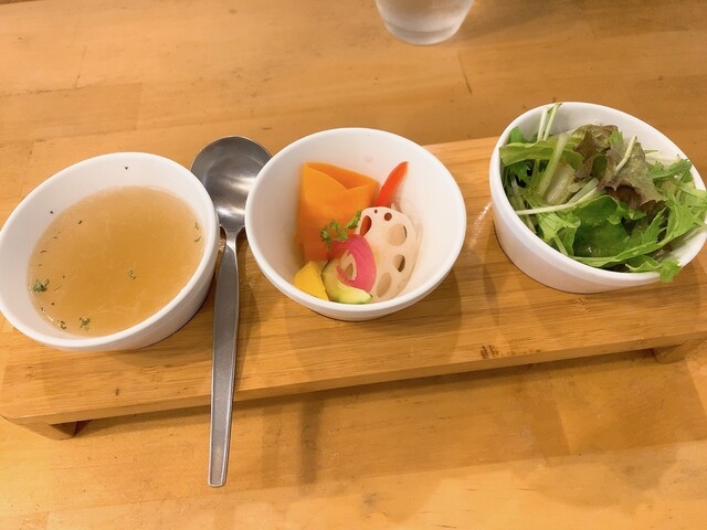 まず最初に、スープと前菜の3種小鉢から。ピクルスは自前のソースで店頭販売もされている。