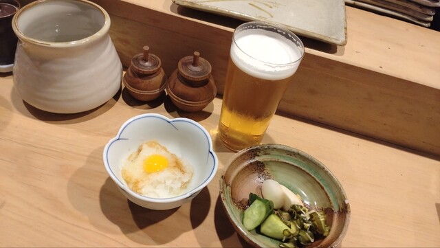 祭日の5時に個室を予約して入店。食前酒は金粉入りのすっきりとした味わいの日本酒。前菜、椀物、お造りといいタイミングで提供されました。お造りの段階でビールから日本酒に切替えてました。鰈の酒盗焼は骨までカ...