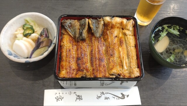 平日の11時半に1週間に予約をして2名で利用。テーブル席に案内をされました。開店時間に入店したのですが、カウンターには先客が1名おり、肝焼きとお酒を呑んでいらっしゃいました。事前に肝焼き1本と玉子焼一つ、特上を2人前お願いしていたので、まずは肝焼きから提供されました。事前情報でわかっていたのですが、改めて肝焼きのボリュームにびっくりでした。そして、さっぱりとした甘みを抑えたタレがビールにはぴったりとした感じでした。今まで食べた肝焼きの中では一番感動した逸品でした。この肝焼きで冷酒もいただきたかったところでしたが、お昼なので自重しました。次に出された玉子焼は少し甘みのあるふわっとした玉子焼でした。大根おろしを2つ添えて提供される心遣いがうれしいです。10分程経過してビールを飲み干した頃にメインの鰻重が出てきました。この鰻重のタレもサラッとした感じのさっぱりとした甘さを控えたものでした。柔らかな鰻の旨味を引き出していると感じがしました。濃いめのタレに慣れているため少し物足りなさを感じたところもありましたが、十分美味しくいただくことが出来ました。次回は肝焼きと白焼きで日本酒を傾けたいと思います。どうもご馳走様でした。