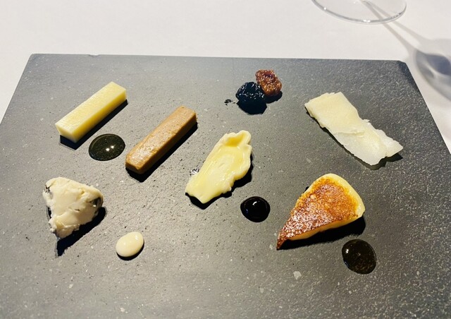 チーズのプレート、前菜のサラダと同じ、生産者を尊敬し、いろんなチーズを試させる一品。パンも合わせて食べれるし、酒との相性もよく。