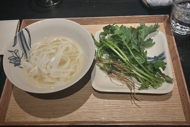 もっちり硬めの麺にパクチー、ルッコラなどの