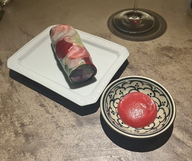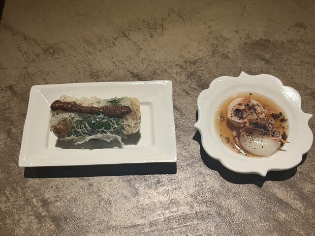・揚げ春巻き、アオリイカと新じゃがいもに