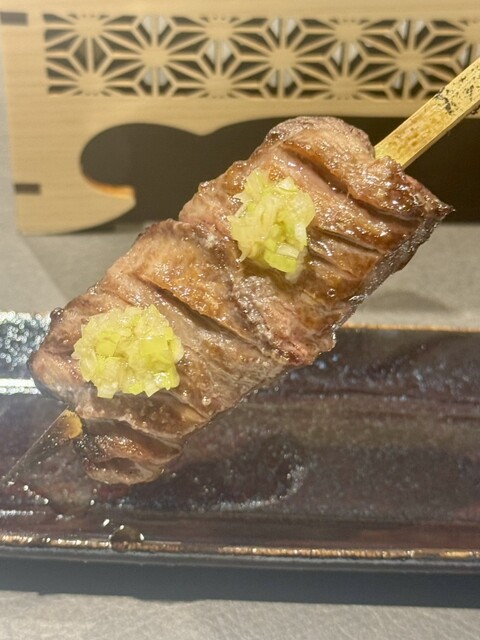 力強い旨味を湛えた牛タン串。これまた九条ネギが乗せてあることで