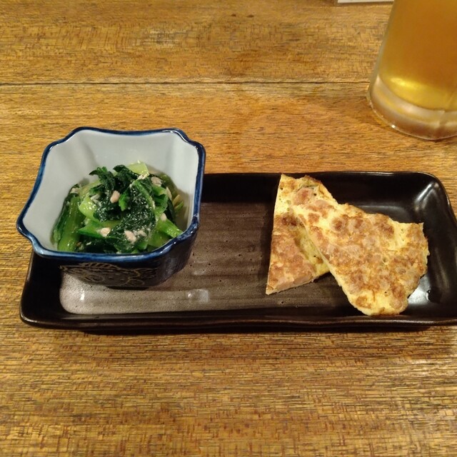 お通しは「冷奴」と「納豆オムレツ」の組み合わせ。