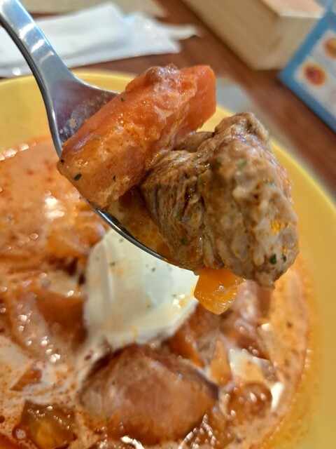 驚きはサワークリームだけにあらず、でっかい肉はほーろほろ、野菜もなんかいろんなもん入っとる。スープに至っては何時間炊き込んでんねん!健康的やー。ほんま、夏バテ解消にもってこい。