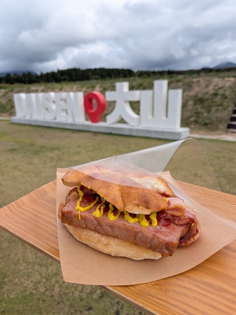 大自然のなか、大山ハム工場に隣接したショップでテイクアウト。レジャーシートが無料貸出しで、前の芝生で大山見ながらゆったりとした時間もいただける。