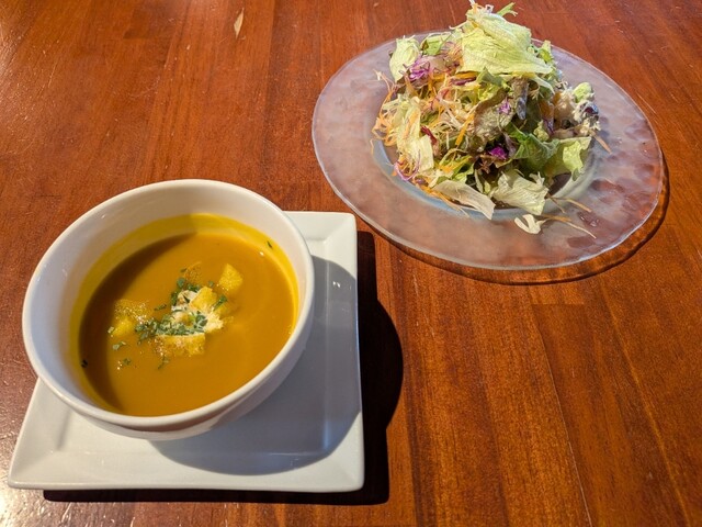 しばらくするとスープとサラダが運ばれてくる。ミニコース形式。意識高い系だ。サラダの入物、ガラス製、意識高い系。スープはポタージュじゃなくてミネストローネ、意識高い系。そしてメイン登場。なんと、火を通すのに苦労する真ん丸ハンバーグの上に、運ぶのが苦労する野菜オントッピング、フランス料理みたいにソースかけてあるだけでなく丸く広げた上にのっている………いや〜非常に意識高い。