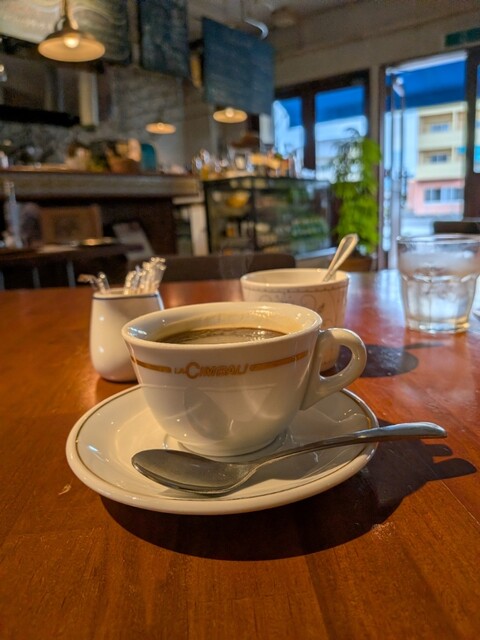 ありゃりゃ?空港行きのバスがまた1本へらされてる………ってところのバス停の向い、コンクリートと木を使った小洒落た意識高い系の家。その1階にこれまた目の覚める様なブルーの庇の意識高い系のイタリアン?カフェ。