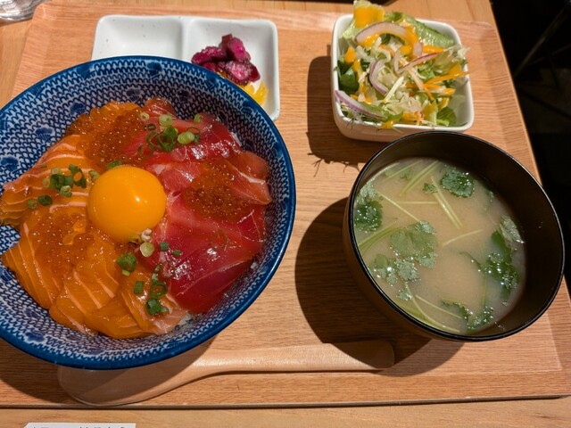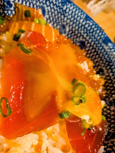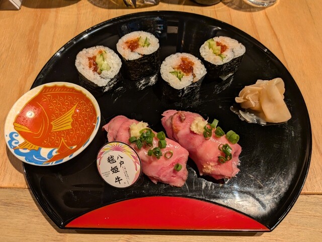数ある巻からマンボ巻なるものを選ぶ。筋子ときゅうり、一口!うほっ!これには辛口の日本酒がいい!次は地元毬姫牛のにぎりをがぶり…う、う、とろけるぅ〜。その頃、デデーン、マグロとサーモンの2色丼とうちゃーく。