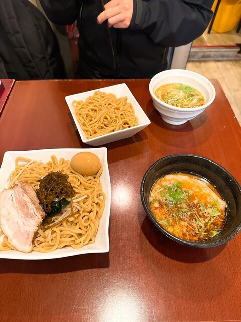 シャリキンホッピーなんかあるので、此奴らセンスある。現在進行形勤務中で部下も一緒なので流石に飲酒NG。ラーメンとつけ麺の二本建てですが、地元:佐賀には余りつけ麺が生息していないので、ここはつけ麺チョイス。腹が減っていたので私は200円余計に支払い、特製辛つけ麺大盛り、部下の子は普通のつけ麺をオーダー。