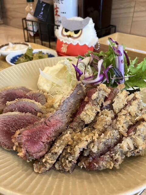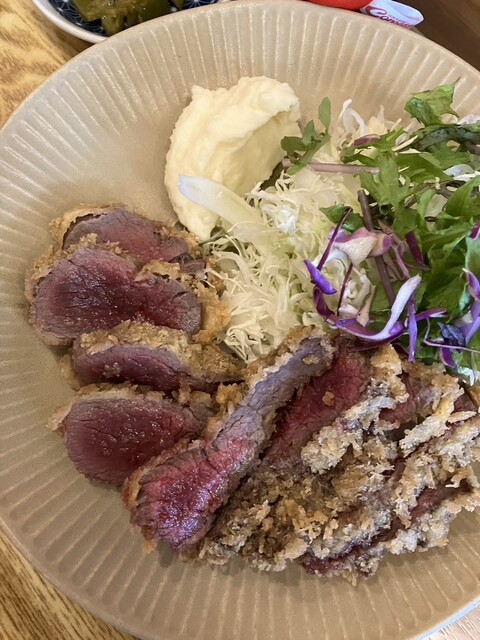 相方の鹿カツを一切れもらい食べましたが、初めての鹿肉、とても肉肉しくとても美味しかったです♪ソースなしで十分食べられます。鹿ステーキも食べてみたいな〜!鹿肉についてシェフの方とお話しをさせていただき、ほんのちょっと知識がつきました♪お店の方はもともとはイタリアンのシェフだそうです。店舗の外と中には薪が並べてあるので、なんでだろうと思ったら、お店の中にピザ窯があり納得!
