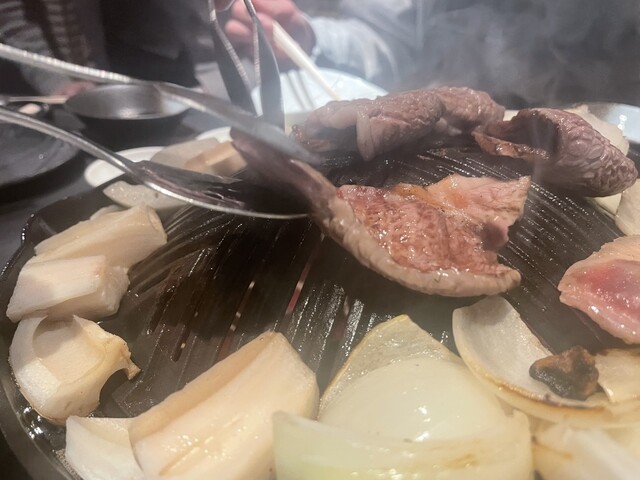 全てのお肉は、鉄板を前に焼師が手際良く焼き上げるライブ感も楽しめる。