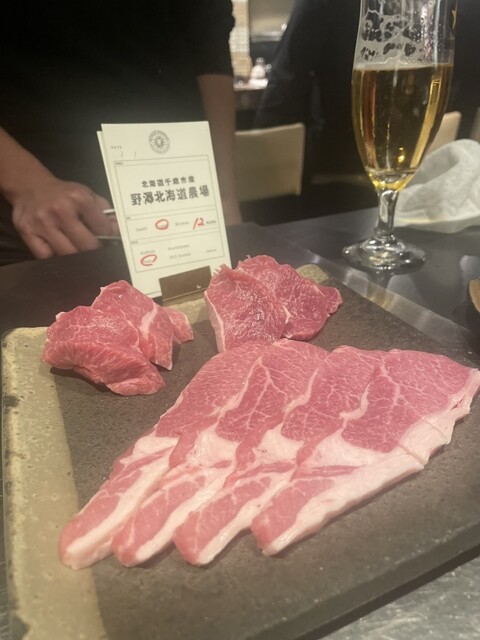 主菜として「炙りユッケ」「AUS盛り合わせ」「土別産」「帯広産」「千歳産」をいただきました。