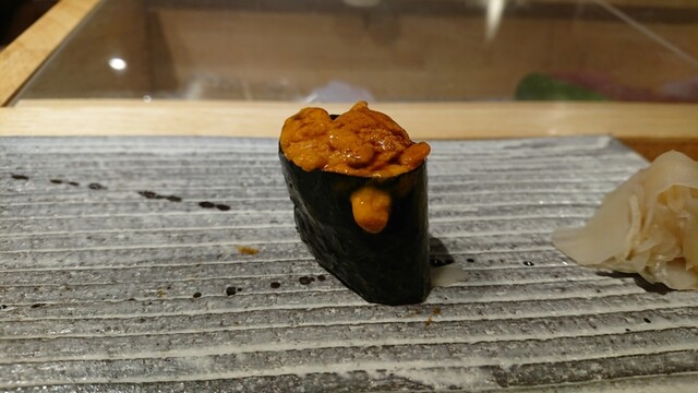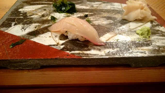 近鉄『高の原駅』から徒歩15分(自分は道が分からなくなりタクシーを利用)に立地する寿司店。帰りは店からタクシーを使用しましたが、大宮まで2,000円かかりません。これなら最初からタクシーでもよい距離。駐車場もありますので、酒抜きなら自動車でもOK。評判を聞きつけ、当日は電話予約の後訪問。仕入れの関係か、電話した際にオーダーの内容を聞かれます(自分は聞かれた)ので、回答を用意しておいた方が話はスムーズです。お店はカウンターのみ。店内の設え、そしてタネ箱を使用したスタンスに好感度MAX。そして料理は、まさかの本格江戸前。関西出身の大将でしたので、関東での修行経験があるのか聞いてみたのですが、大阪帝国ホテルの『あの店』出身。なるほど、料理にその雰囲気が出ております。オーダーは、ツマミから握りまで『おまかせ』。板場は大将1人ですが、1人で捌ける客数しかとらないので、皿出しにはまったく問題なし。握りは標準的な大きさ。シャリをやや少な目にしてありますので、女性でも貫数を食べられます。シャリの炊き具合はやや固め。自分のもっとも好みの固さ。そして酢がタッているところが江戸前らしくていい。握りは綺麗な舟形。煮キリは塗ってあり食べるだけ。包丁さばき、握り、タネの選び方、仕込み、どれをとっても、既に名店レベルです。ツマミ6品、握り10貫、酒大筋で8杯を2人の支払いで30,000円そこそこ。ご当地に来たら常連になること間違いなし。