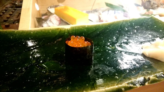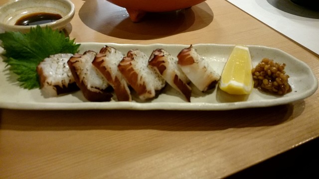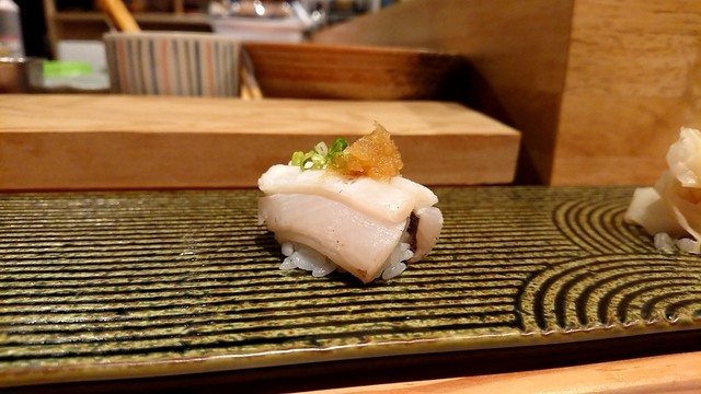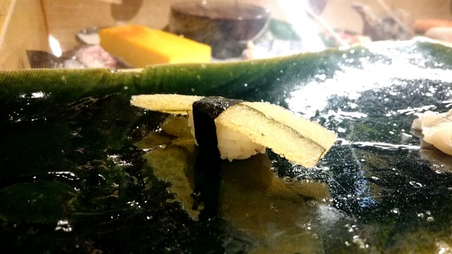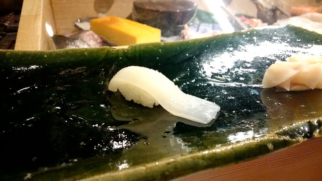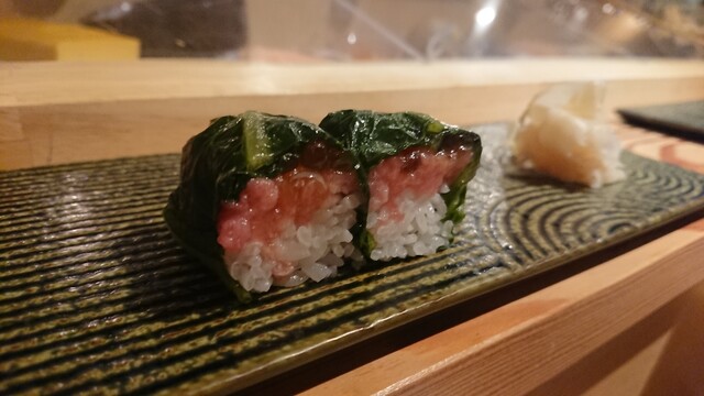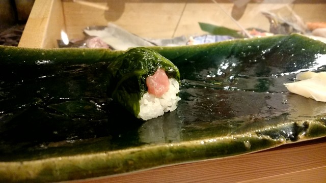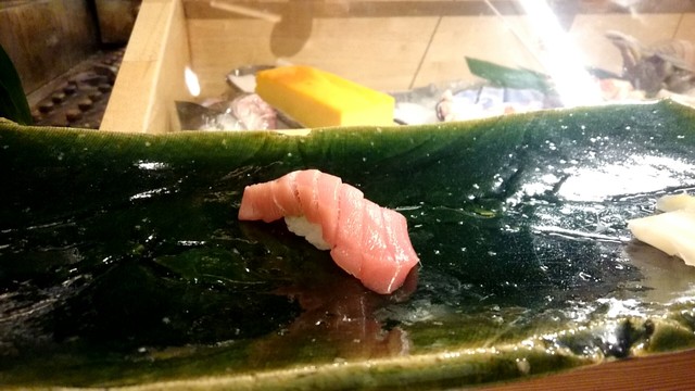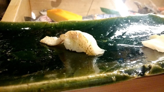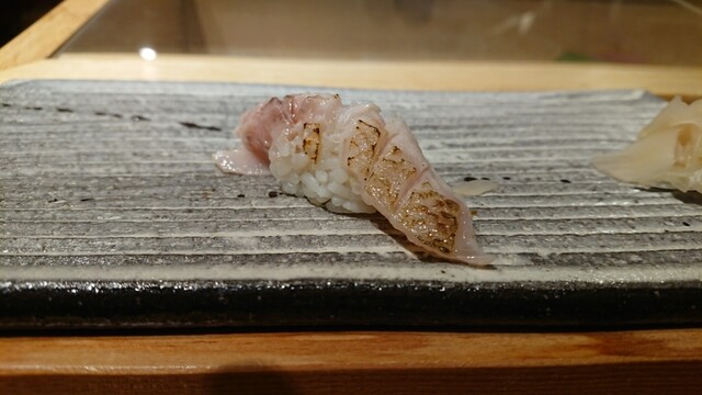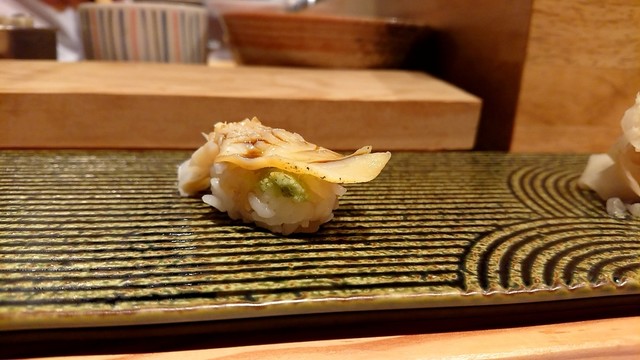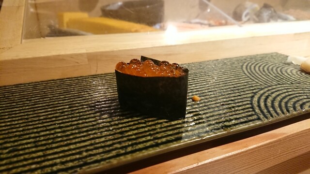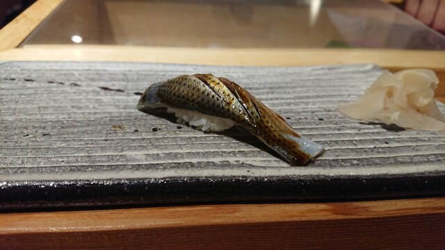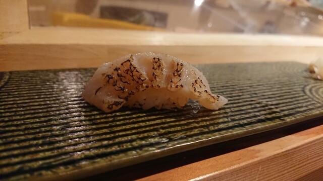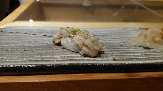 煮切りや生醤油が塗ってあり、握りをそのまま食べる江戸前スタイル。シャリ玉はやや小ぶりであるので、女性であっても種類を多く食べられる。関東ではなかなか出てこないタネを江戸前で食べられるのは、幸せの極致。