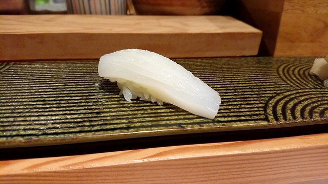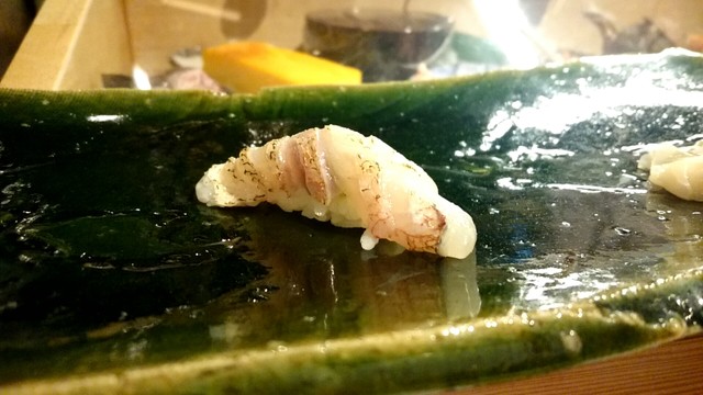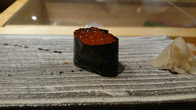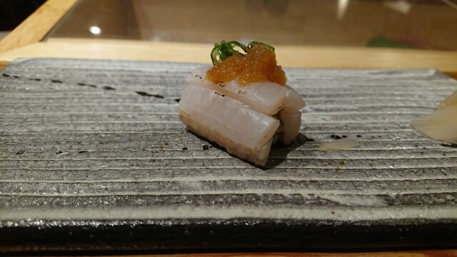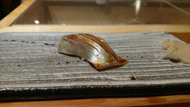 煮切りや生醤油が塗ってあり、寿司は握りをそのまま食べる江戸前スタイル。シャリ玉はやや小ぶりで、握りは舟形、女性であっても種類を多く食べられる。関東ではなかなか出てこないタネを江戸前で食べられるのは、幸せの極致。