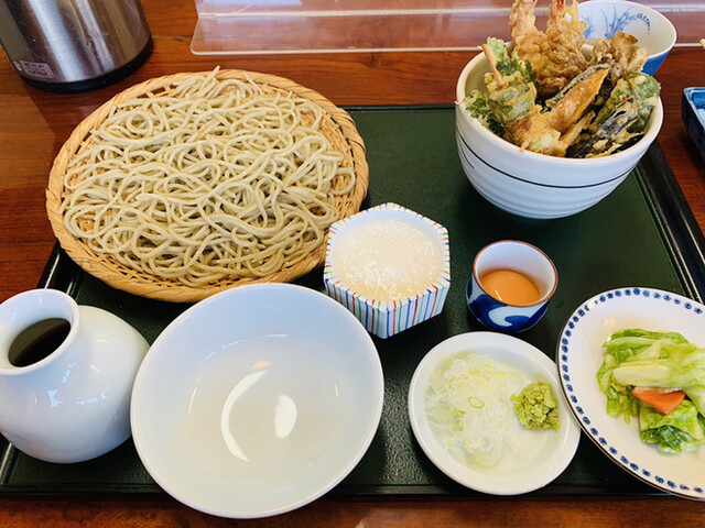 注文したのはミニえび天丼と手打ちざるそばのセット(1,150円)、そば大盛(200円)です。