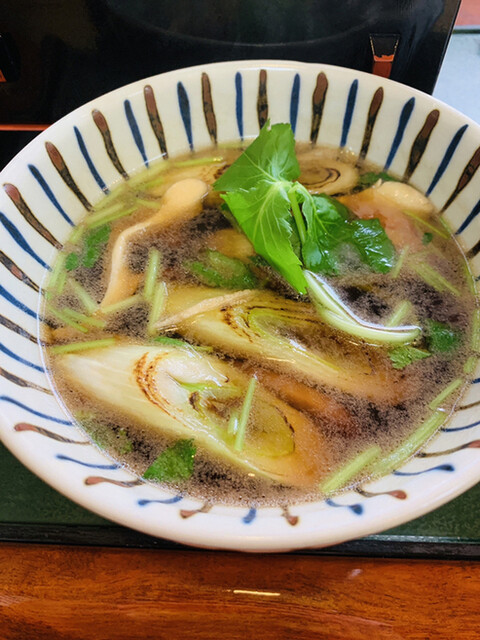 具材は鴨肉、ネギ、舞茸、ゴボウ、三つ葉が入っていて鴨肉は程良い弾力の噛み応えでとてもジューシー♫