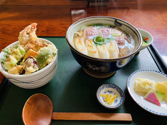 お盆の上には鴨なんばんそば、ミニえび天丼、お浸し、漬物、柚子皮が乗っていてボリュームありそう⤴︎
