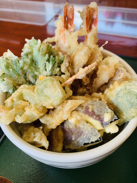 ミニエビ天丼はエビ×2尾、大葉、舞茸、カボチャ、ピーマン、ナス、インゲン、ネギといつも通り具沢山⤴︎