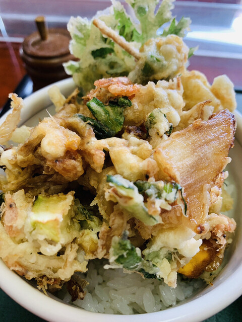 海老×2尾、南瓜、牛蒡、茄子、舞茸、ピーマン、ネギ、それと春菊?のような葉の天ぷら(食べてみると春菊っぽいあの苦味なんかは感じませんが何だろう…別の山菜かな)と種類沢山揚げ方抜群の天丼です。