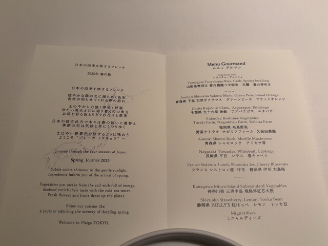フレンチレストランではありますが、お店のコンセプトは「日本の四季を旅するフレンチ」。その名の通り、この日は「春の旅」でシェフの出身である福岡県糸島をはじめ、北は青森から神奈川や千葉、静岡、長崎など日本各地の食材を用いた構成。ディナーコースはムニュ・デギュスタシオン(8品・15,500円)、ムニュ・グルマン(10品・19,500円)、特選飛騨牛フィレ肉コース(25,000円)の3種類。