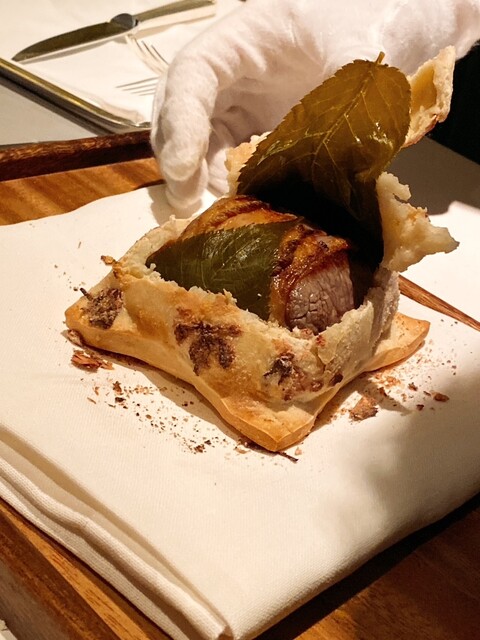 塩釜焼風に仕立てたパイから出現するのは桜の葉で巻かれた仔羊肉!生地が分厚くやや切りにくそうではありましたが、調理工程の一部を見ることが出来るのは嬉しいポイント。大胆な見た目のパイ生地からは出来上がったのは、こちらも美しく盛り付けられた一皿。野生味ありつつ、食べやすい味わいのフランス産仔羊と日本人であればきっと誰もが親しみを感じる桜を使ったタプナード、意外な組合せでしたが絶妙にマッチ。