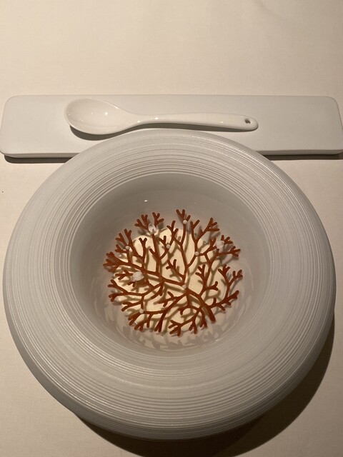 つや姫米を使ったシグネチャー。お米を使ったフランスのデザート・リオレから着想を得たとのことで、真っ白なお米のムースの上には桜の木を模した米粉のチュイール、下には毛蟹がたっぷり。お米の粒々食感を残すリオレとは異なり、生クリームのような口当たりのなめらかさはあるものの、動物性の重さは感じず、お米の優しい味わいが際立ちます。そこに毛蟹の旨味が加わり、こんな言い方したら怒られるかもしれませんが、例えるならば超贅沢なカニクリームコロッケの中身。シャンパンとの相性も抜群で最初の一品から大満足。
