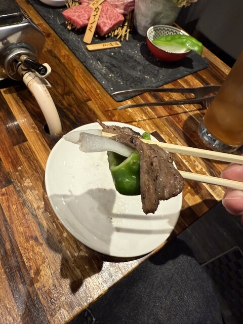 さらに、上バラはピーマンと酢大根で巻いていただくと、その脂のコクに爽やかな酸味と青さが重なり、絶妙なバランス。焼肉でありながら重さを感じさせず、食べ進めるごとに次の一枚が楽しみになる構成です。