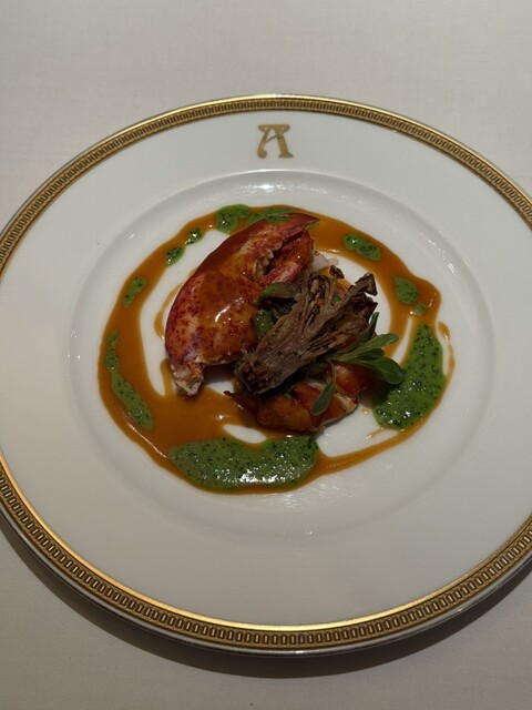 「カナダ産オマール海老のポッシェ」は、本日のハイライトのひとつ。肉厚のオマールは火入れが完璧で、アメリケーヌソースの深いコクにソースが重なることで、まるで海の層を味わっているかのような奥行きを感じました。香り、旨み、余韻、そのすべてが静かに美しくまとまっています。