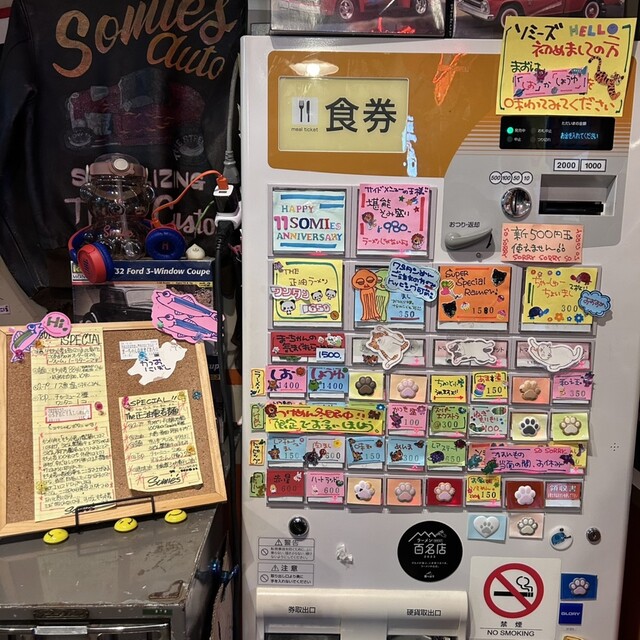 お正月に来た以来だったけど、券売機が大きくなって店内に移動してて、最初の記名ボードも店内にありました。