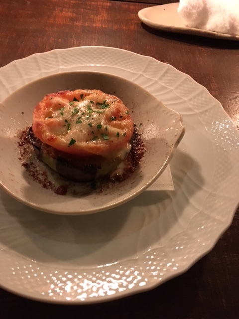 米茄子とトマトの重ね焼きはスカモルツァチーズを乗せてオーブンで仕上げており、こちらも酸味と甘味が絶妙な一品!