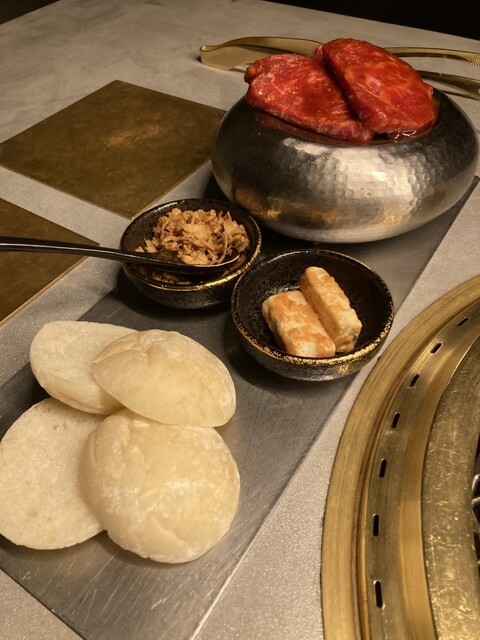焼肉店のコース料理をしっかり味わってみたくなり、肉屋甲の「慶コース」を注文しました。前菜の和牛サラダ、和牛のお刺身、カラスミ入りのユッケと、スタートから肉尽くしで期待が高まります。