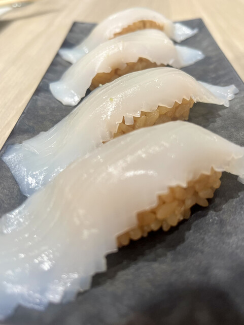 食べ終わって、はてお寿司屋さんで醤油皿を使わなかった?ということに驚きました。お醤油一滴も垂らしていませんでした。何故なら、熟成、炙り、塩と既に味付け済みかそのままで食べるネタに終始していたという事ですね。とにかくとても美味しくいただきました。一見東京駅八重洲口のデザインみたいでオシャレです。なのにペットフレンドリーなお店が多く、大変有り難い限りです。ちなみに、頂いたのは熟成のイカ各種、ハマチ、シマアジ、メヒカリ、マグロ各種、琴浦サーモン、そして紋別真ふぐ、、の精鋭たち。皆とても美味しく頂きました。赤酢に上品なシャリの量なので沢山ネタを食せますし、進みます。特にマグロ熟成は本当に濃厚です。トロたく握りはお代わりしたかった、すぐ売り切れた模様で悔しい。真ふぐは歯ごたえが凄いってなんの、イカはスルメが一番ねっとり感が強かったかな、シマアジもハマチも旨味の余韻を堪能しました。もしかして、築地と新豊洲に行くよりココの方が好みのネタが多いかもしれません。あっという間にお腹いっぱいになってしまいました。大満足です、ご馳走様です。また来ちゃいます。